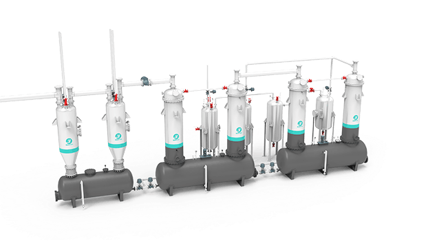 全連續(xù)煉油設(shè)備由反應(yīng)釜、驅(qū)動系統(tǒng)、取樣器、螺旋除渣器、汽包系統(tǒng)、靜電除塵器、水冷出渣機、油氣冷凝系統(tǒng)、水冷炭黑儲存罐、螺旋進(jìn)料機、稱重機、料倉等幾部分組成